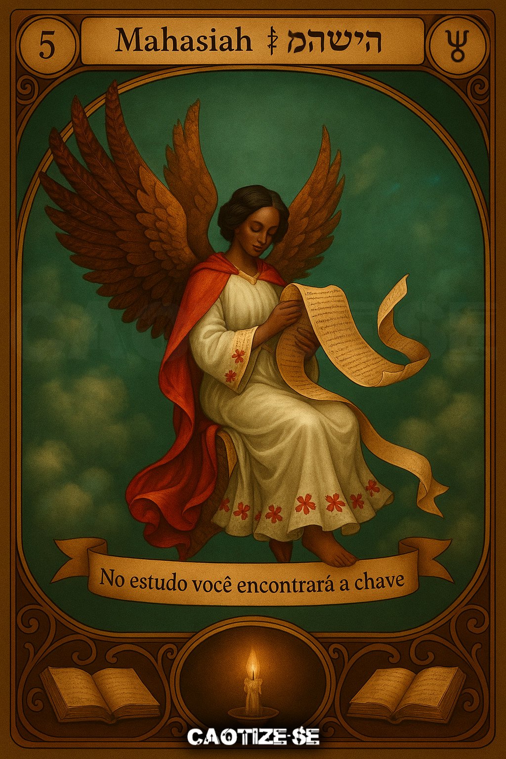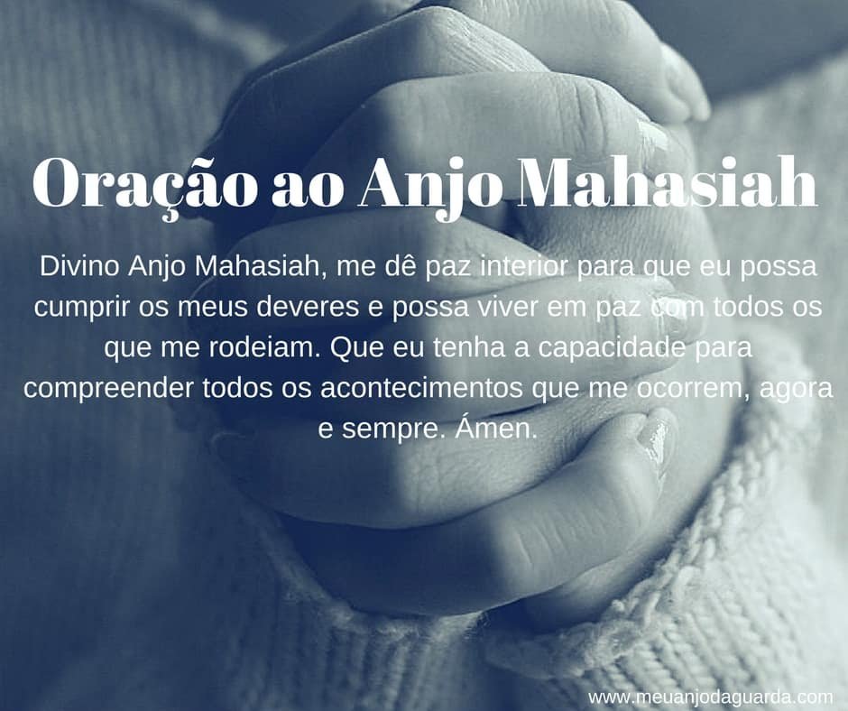 Divino Anjo Mahasiah, me dá paz interior para que eu possa cumprir os meus deveres e possa viver em paz com todos os que me rodeiam. Que eu tenha a capacidade para compreender todos os acontecimentos que me ocorrem, agora e sempre. Ámen. Salmo para preces: (33, Versículo 4) “Pois a palavra do Senhor é verdadeira; ele é fiel em tudo o que faz.”Significado de Mahasiah em tiragens de divinação