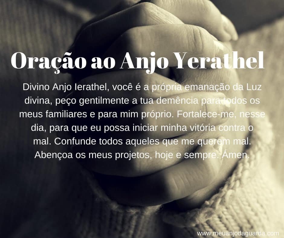 Divino Anjo Ierathel, você que é a própria emanação da Luz divina, peço gentilmente a tua clemência para todos os meus familiares e para mim próprio. Me fortaleça, neste dia, para que eu possa iniciar a minha vitória contra o mal. Confunde todos aqueles que me querem mal. Abençoa os meus projetos, hoje e sempre. Amem.