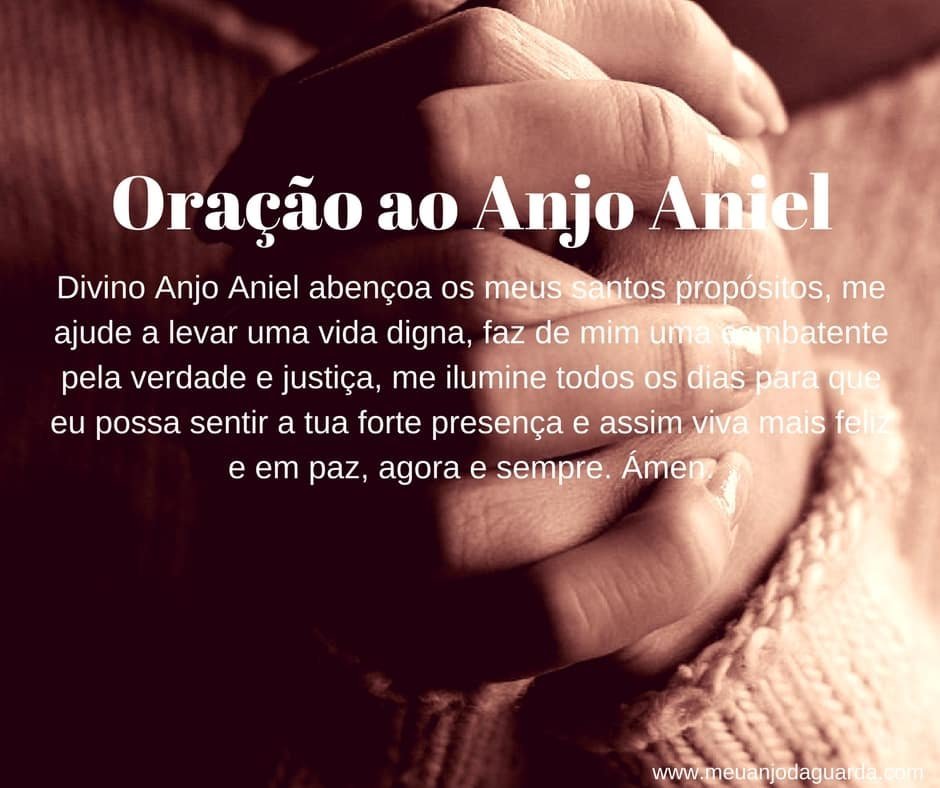Divino Anjo Aniel abençoa os meus santos propósitos, me ajude a levar uma vida digna, faz de mim uma combatente pela verdade e justiça, me ilumine todos os dias para que eu possa sentir a tua forte presença e assim viva mais feliz e em paz, agora e sempre. Ámen. Salmo mais indicado para preces: (79, versículo 4) “Somos objeto de zombaria para os nossos vizinhos, de riso e menosprezo para os que vivem ao nosso redor.”Observação importante sobre ativação e alimentação