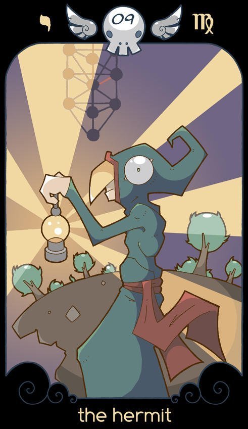 Também conhecida como: O Ermitão Este Arcano Maior apresenta uma figura masculina solitária. Um ancião. Ele permanece afastado de tudo e de todos. Ele contempla o seu mundo interior, e a solidão lhe acompanha no caminho que segue. É uma pessoa que aparenta experiência de vida e sabedoria.  Demonstra o silêncio e a placidez em suas expressões fortes, mas calmas. Geralmente, carrega alguma fonte de luz, como uma lamparina. Essa alegoria refere-se ao fato do Eremita não ser apenas uma pessoa iluminada, mas aquele que carrega a luz aos seus escolhidos. O Ermitão está em movimento, seguindo seu caminho, carregando sua luz. Não é uma carta estática, e sim que fala de um movimento sem pressa, e sem demora. No tempo certo. Algumas curiosidades sobre esta carta são que ambas as grafias VIIII e IX podem ser encontradas; Além disso, atribui-se a imagem do Eremita à alegoria de Diógenes em busca de um homem. Sua história percorreu séculos, e credita-se a esta relação à presença da lâmpada na lâmina de Tarot, uma vez que na antiguidade fosse comum retratar monges, ou ainda peregrinos, mas sem qualquer imagem de lâmpada.