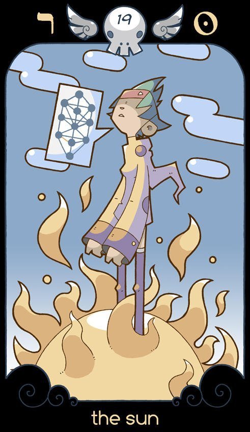 Como símbolo central da lâmina, porém, nenhuma referência mais precisa pode ser feita, uma vez que o Sol em si é representado de maneira mais comum. Os elementos adicionais é que revelam um pouco mais sobre o significado da carta.