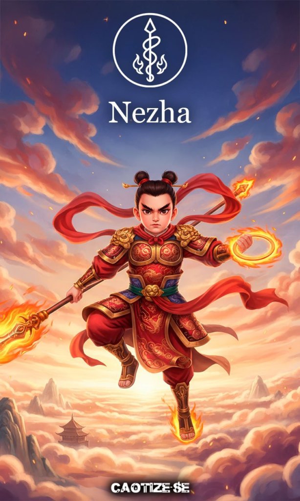 Nezha é uma figura lendária da mitologia chinesa, especialmente conhecida através do clássico Investiture of the Gods (Fengshen Yanyi). Ele é retratado como um jovem guerreiro divino, ousado e rebelde, com poderes sobrenaturais e um espírito indomável. Desde seu nascimento milagroso — emergindo de um ovo após gestação de três anos e seis meses — Nezha demonstra uma força extraordinária e um destino ligado à