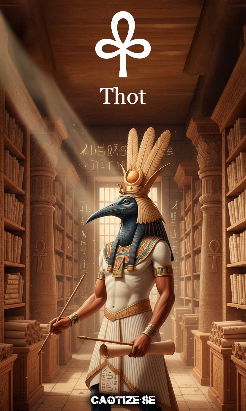 Na mitologia egípcia, Thot (ou Djehuty) é o deus da sabedoria, escrita, magia, ciência e justiça. Representado com a cabeça de íbis ou como um babuíno, ele era considerado o escriba dos deuses, aquele que registrava cada acontecimento e mantinha a ordem do cosmos.
