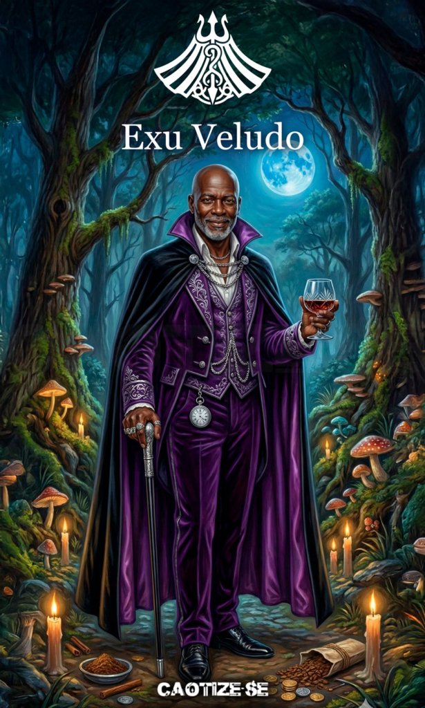 Exu Veludo é uma entidade conhecida por sua finesse, elegância e inteligência espiritual extraordinária. Trabalha com discrição, estratégia e sutileza, atuando nos cruzamentos onde a palavra, a mente e a intenção se encontram.