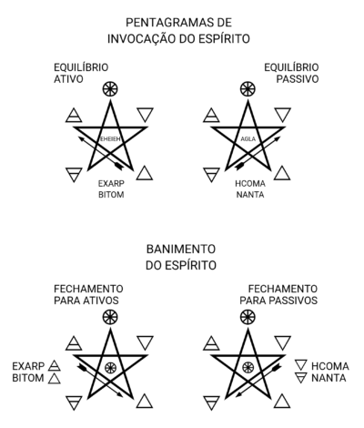 1. Como forma de oração, o Ritual pode ser realizado pela manhã (invocando), e à tarde (banindo). Para banir não basta inverter o traçado das linhas que formam os pentagramas. Você deve começar no Oriente (ou norte) e girar no sentido contrário do relógio. Os nomes devem ser vibrados tanto quanto possível, sentindo-se que todo corpo estremece (vibra) com o som e envia esta onda de vibração para os confins do Universo, isto é, em direção para qual o praticante está virado no momento.